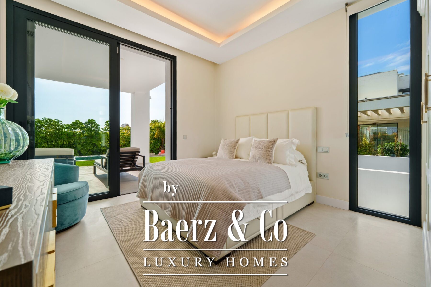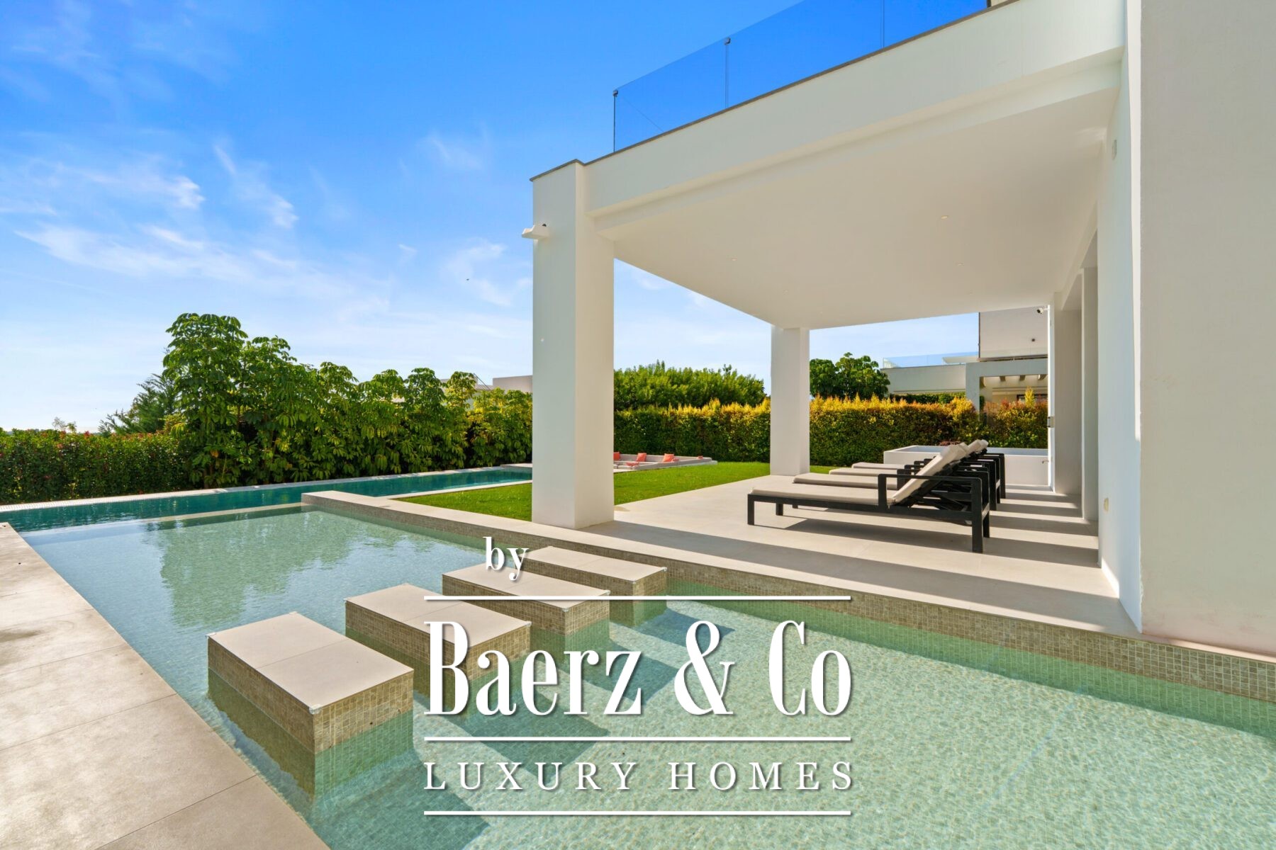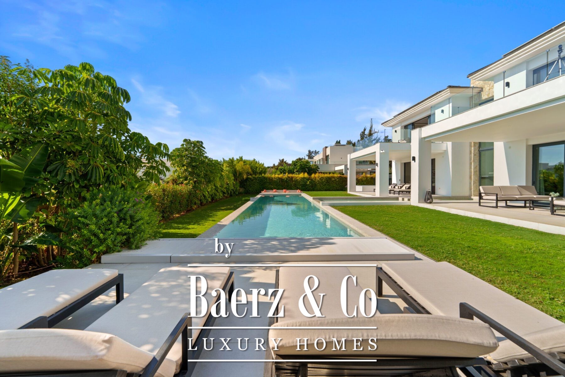 Для досуга и приёма гостей предусмотрена отдельная кинозона с баром, бильярдным столом и проектором. К современным удобствам относятся тепловой насос, солнечные панели с аккумуляторным хранением, система «умный дом» и комплекс охранных мер для вашего спокойствия. Вилла расположена в шаговой доступности от местных магазинов, гольф-полей, пляжей и моря Марбельи, воплощая гармонию архитектурной чистоты и практичности на каждый день.