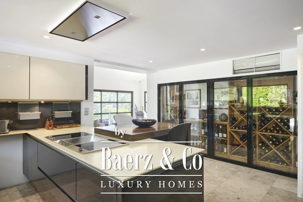 Площадь виллы составляет 250 м², практически вся на одном уровне, что обеспечивает интуитивно понятную и гармоничную планировку. Гостевые зоны приветливы и объединены просторной кухней с винным погребом и функциональной кладовой. В основной части расположены две спальни с ванными комнатами и кабинет, который можно переоборудовать в третью спальню, а в отдельном здании — еще две гостевые сьюты. Внутреннее оформление отличается вечной элегантностью, наличием обратимого кондиционирования, системой теплого пола, домашней автоматикой и атмосферой спокойной устойчивости.