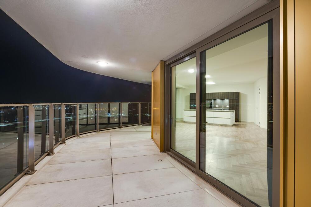 Архитектурная выверенность сочетается с комфортом в организации пространства: частный лифт ведёт в светлый холл, три спальни, две ванные комнаты и просторную гостиную с обеденной зоной. В главной спальне предусмотрена гардеробная и собственная ванная комната с дополнительным туалетом, а к двум другим спальням примыкает вторая комфортная ванная. Все три спальни имеют выход на крытый балкон площадью около 52 м², обрамленный стеклянными ограждениями, расширяя пространство для жизни на открытом воздухе.
