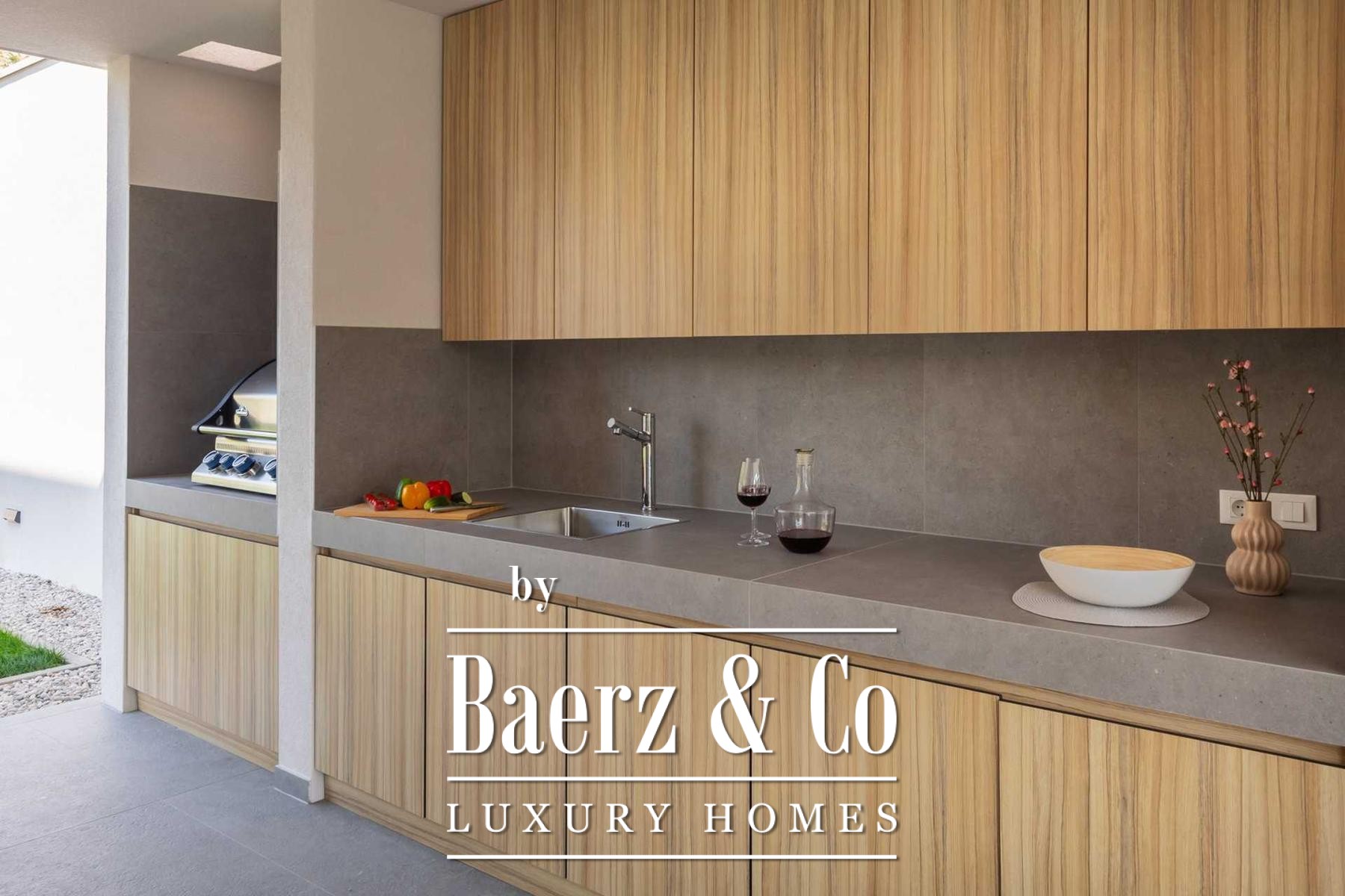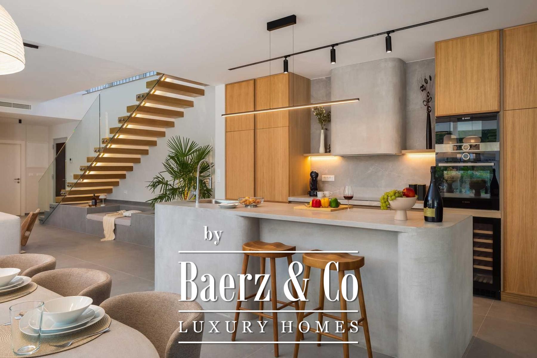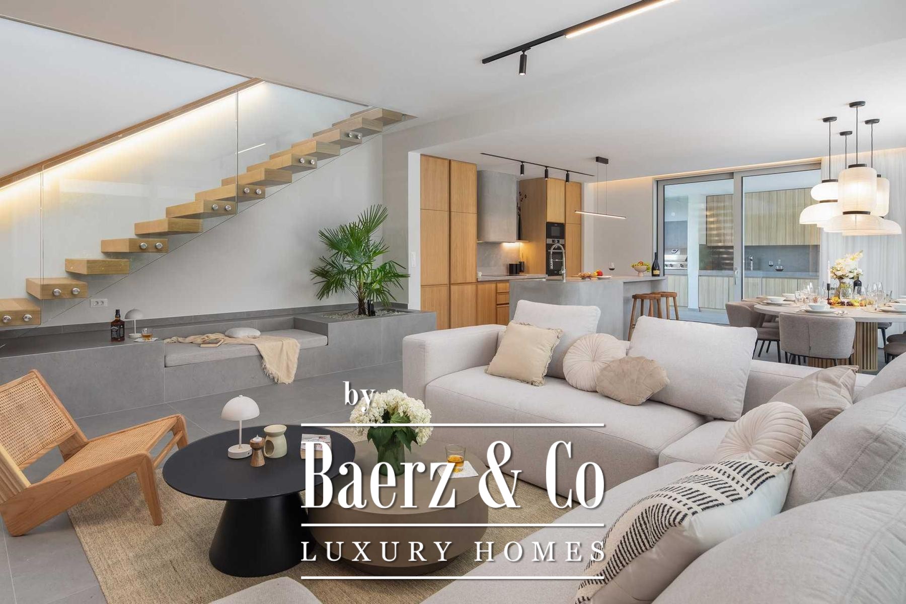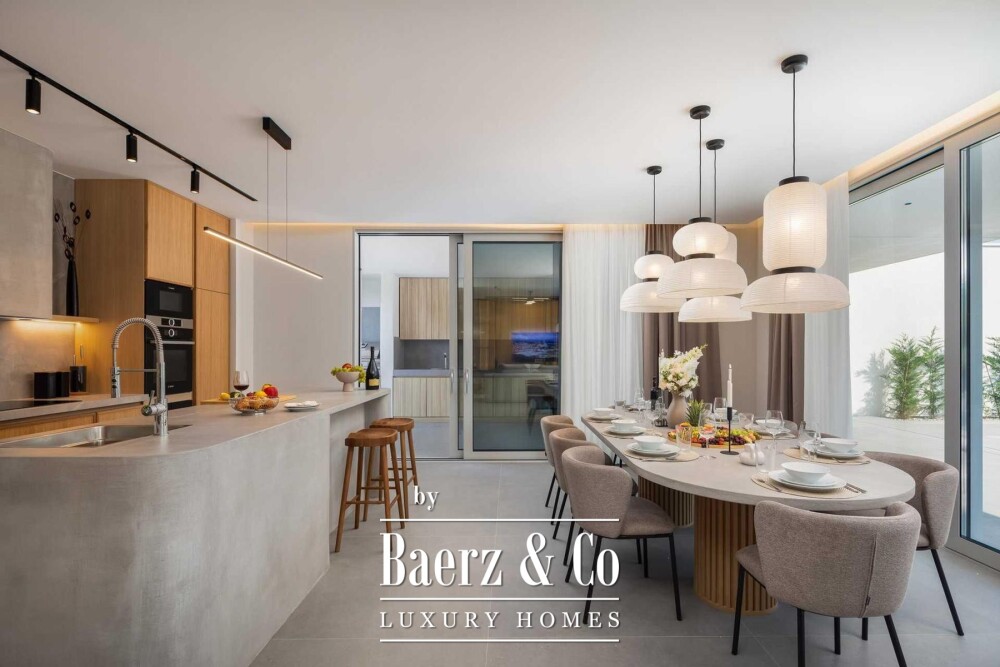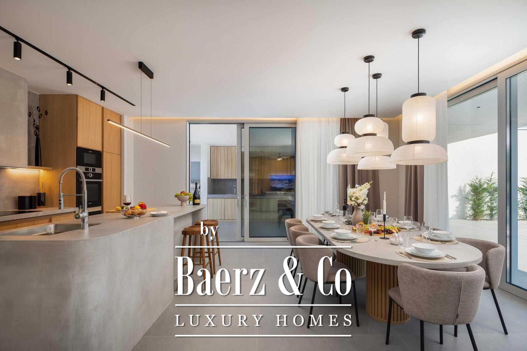 Вход ведет в тщательно спланированное пространство первого этажа, где фитнес-зона с сауной и собственной ванной комнатой создает атмосферу заботы о благополучии. Пространство кухни, столовой и гостиной с открытой планировкой оформлено панорамными стеклянными стенами, наполняющими дом дневным светом и гармонично объединяющими интерьер с садом. К кухне и гостиной примыкают крытые террасы, ведущие к подогреваемому бассейну и благоустроенному солнечному патио.