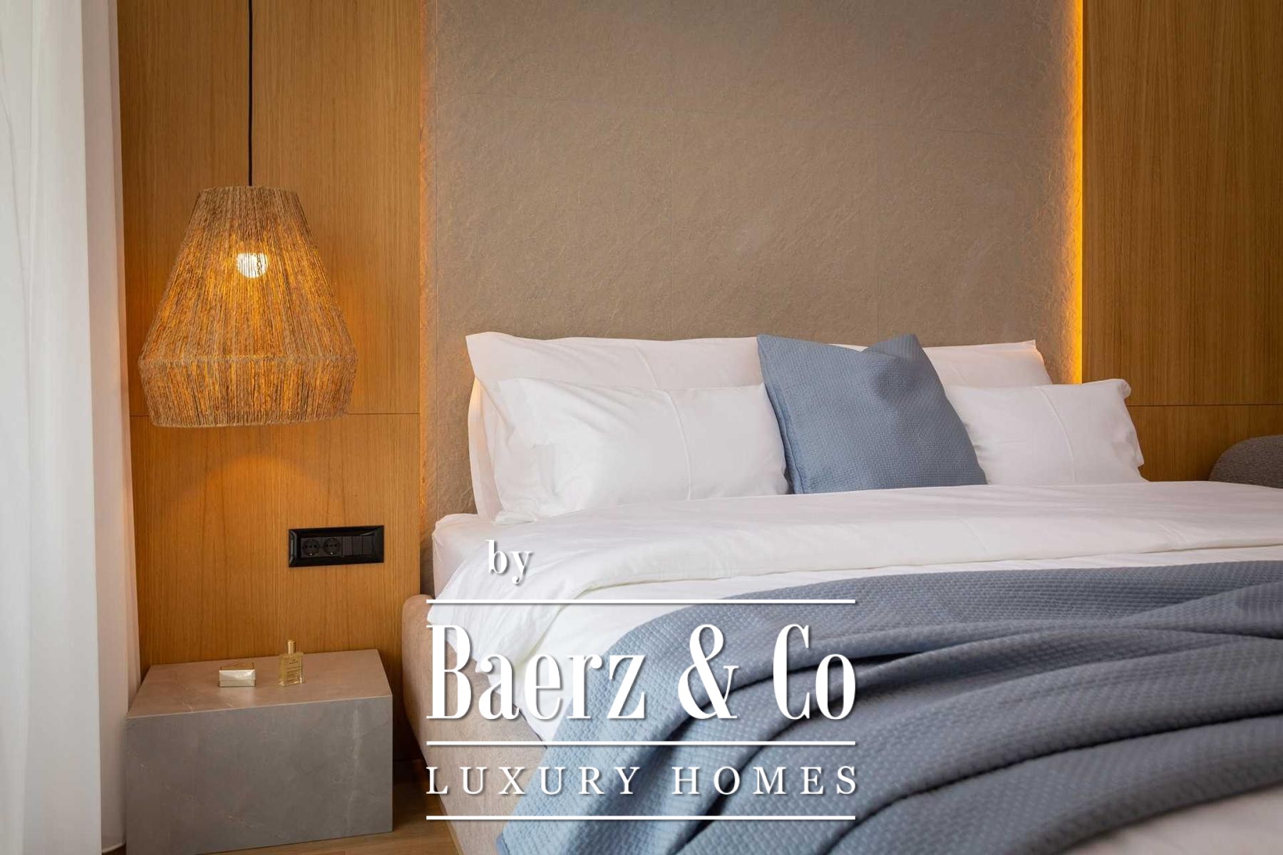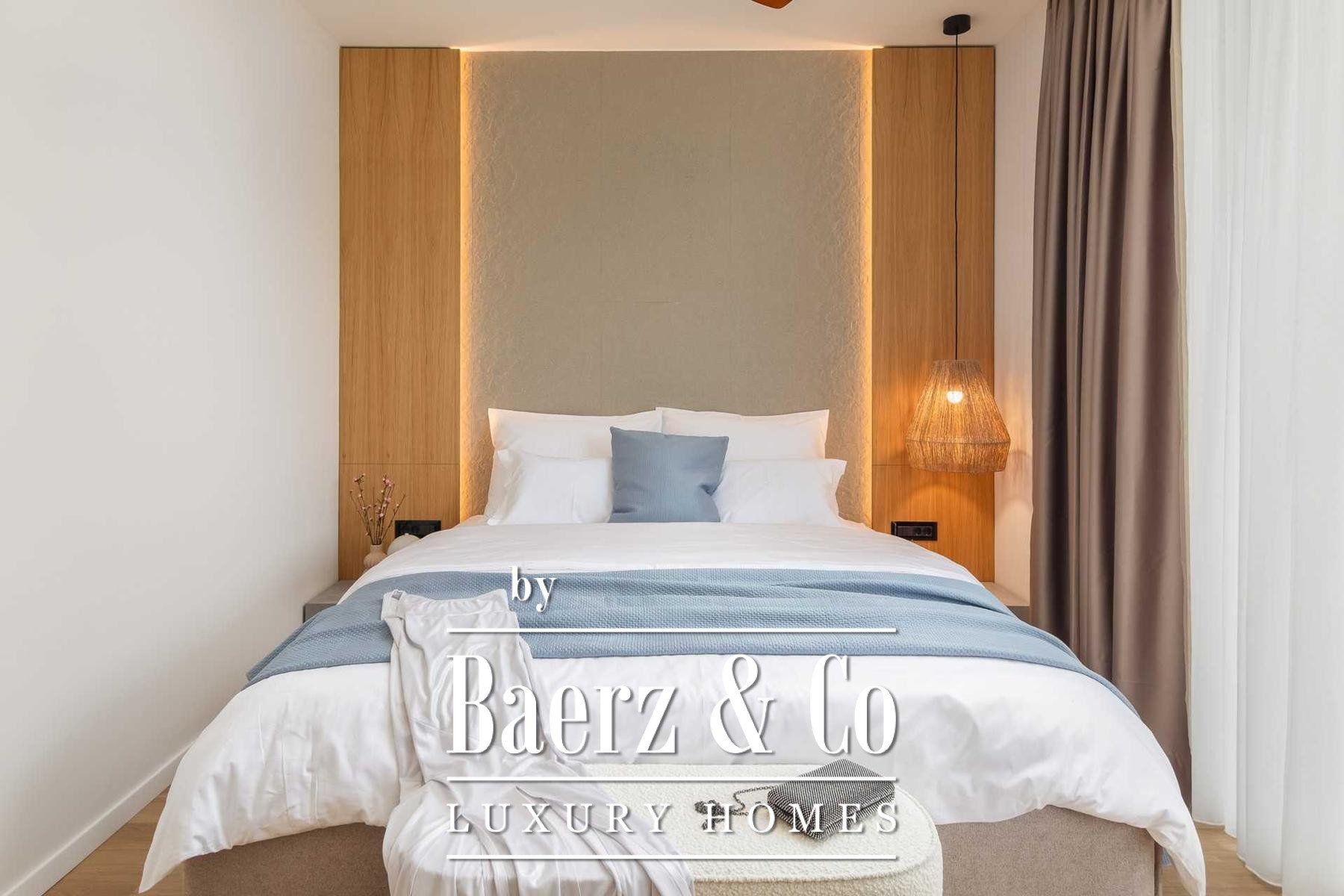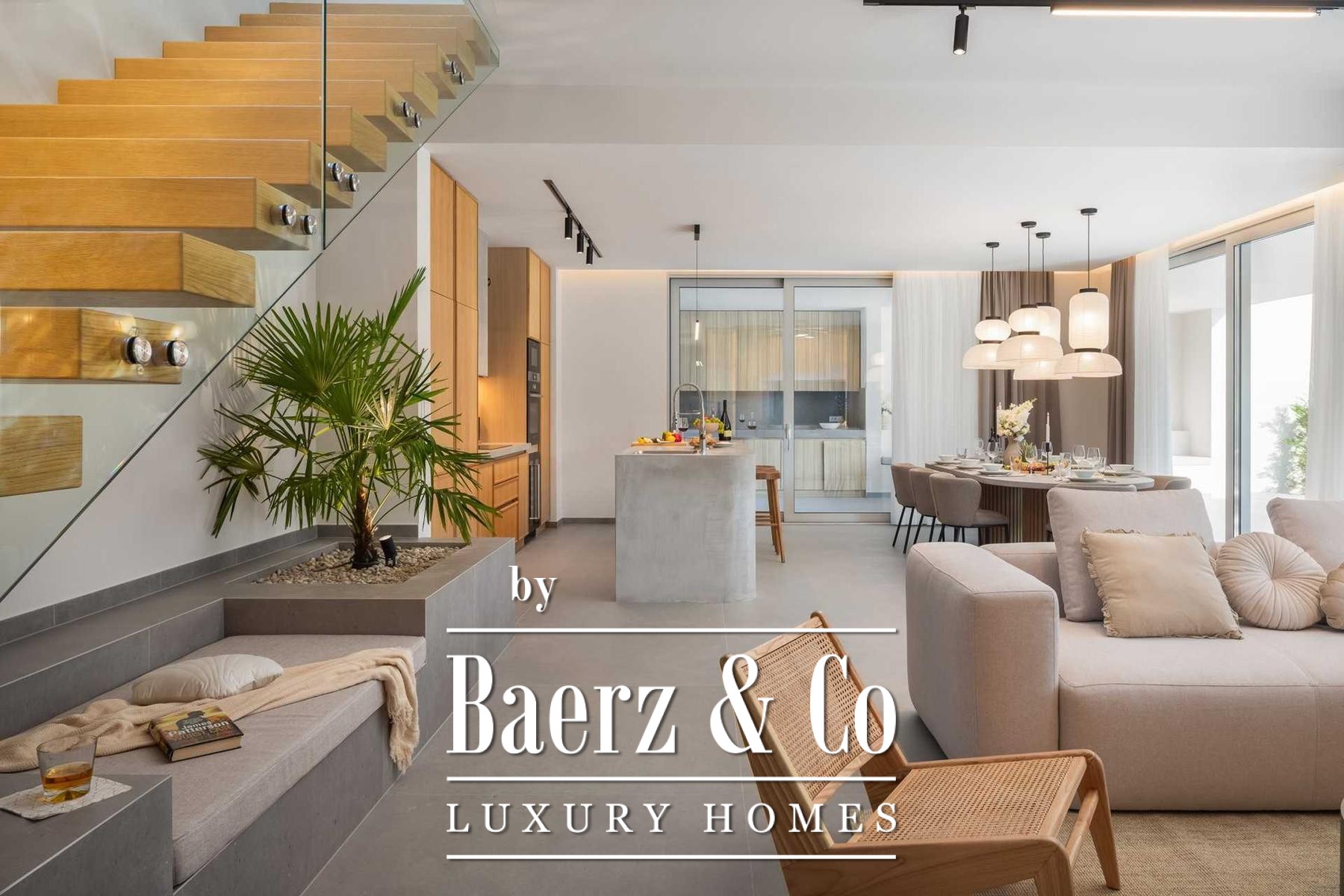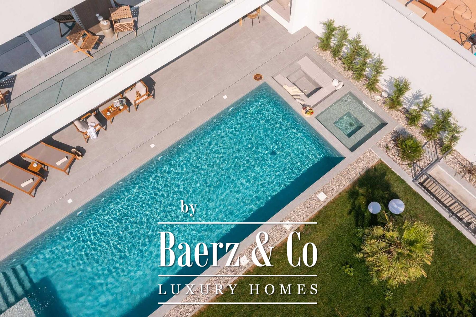 Вход ведет в тщательно спланированное пространство первого этажа, где фитнес-зона с сауной и собственной ванной комнатой создает атмосферу заботы о благополучии. Пространство кухни, столовой и гостиной с открытой планировкой оформлено панорамными стеклянными стенами, наполняющими дом дневным светом и гармонично объединяющими интерьер с садом. К кухне и гостиной примыкают крытые террасы, ведущие к подогреваемому бассейну и благоустроенному солнечному патио.