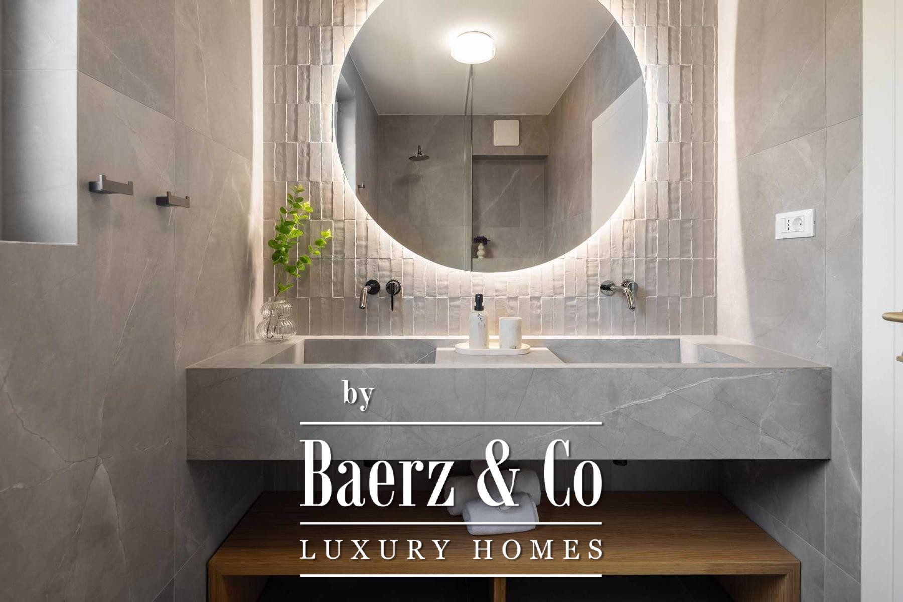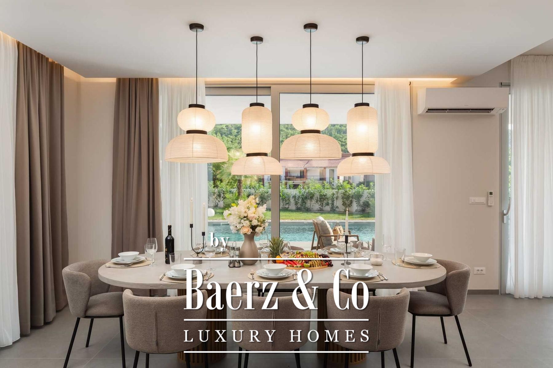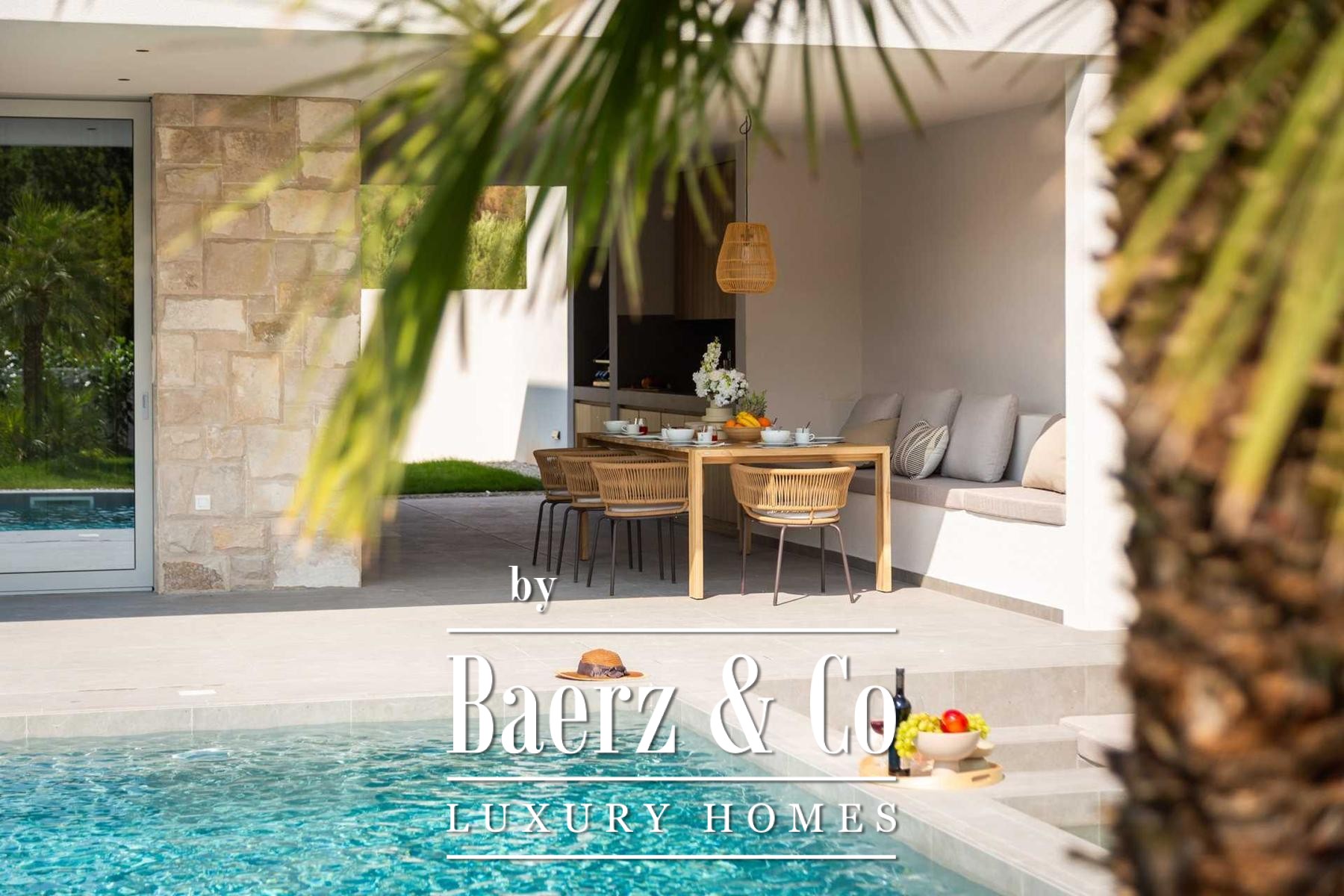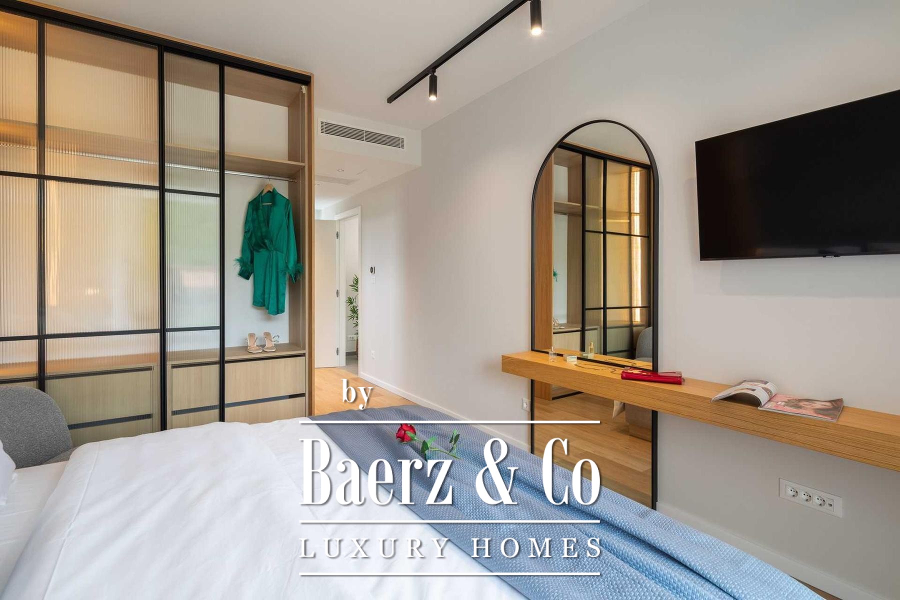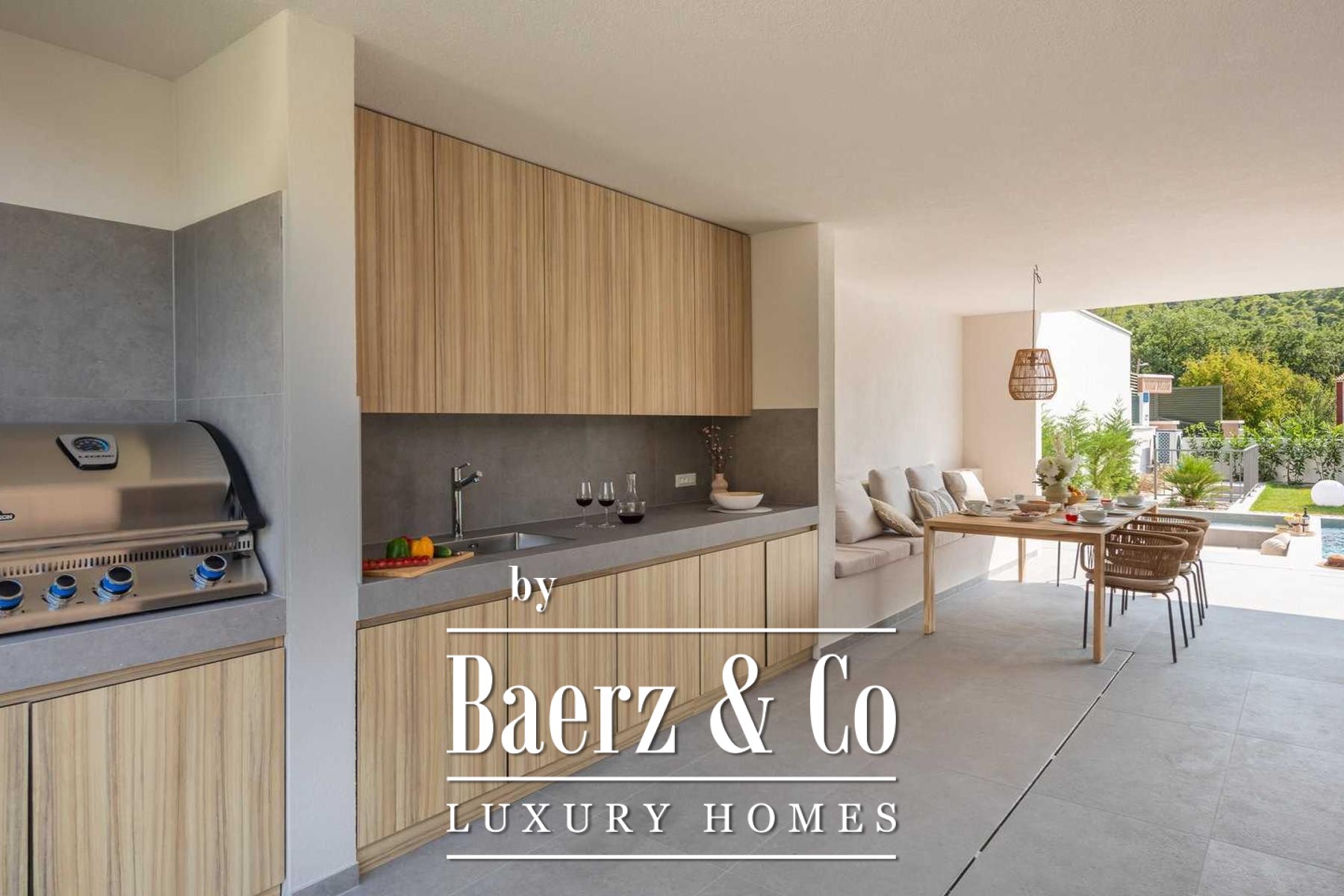 Вход ведет в тщательно спланированное пространство первого этажа, где фитнес-зона с сауной и собственной ванной комнатой создает атмосферу заботы о благополучии. Пространство кухни, столовой и гостиной с открытой планировкой оформлено панорамными стеклянными стенами, наполняющими дом дневным светом и гармонично объединяющими интерьер с садом. К кухне и гостиной примыкают крытые террасы, ведущие к подогреваемому бассейну и благоустроенному солнечному патио.