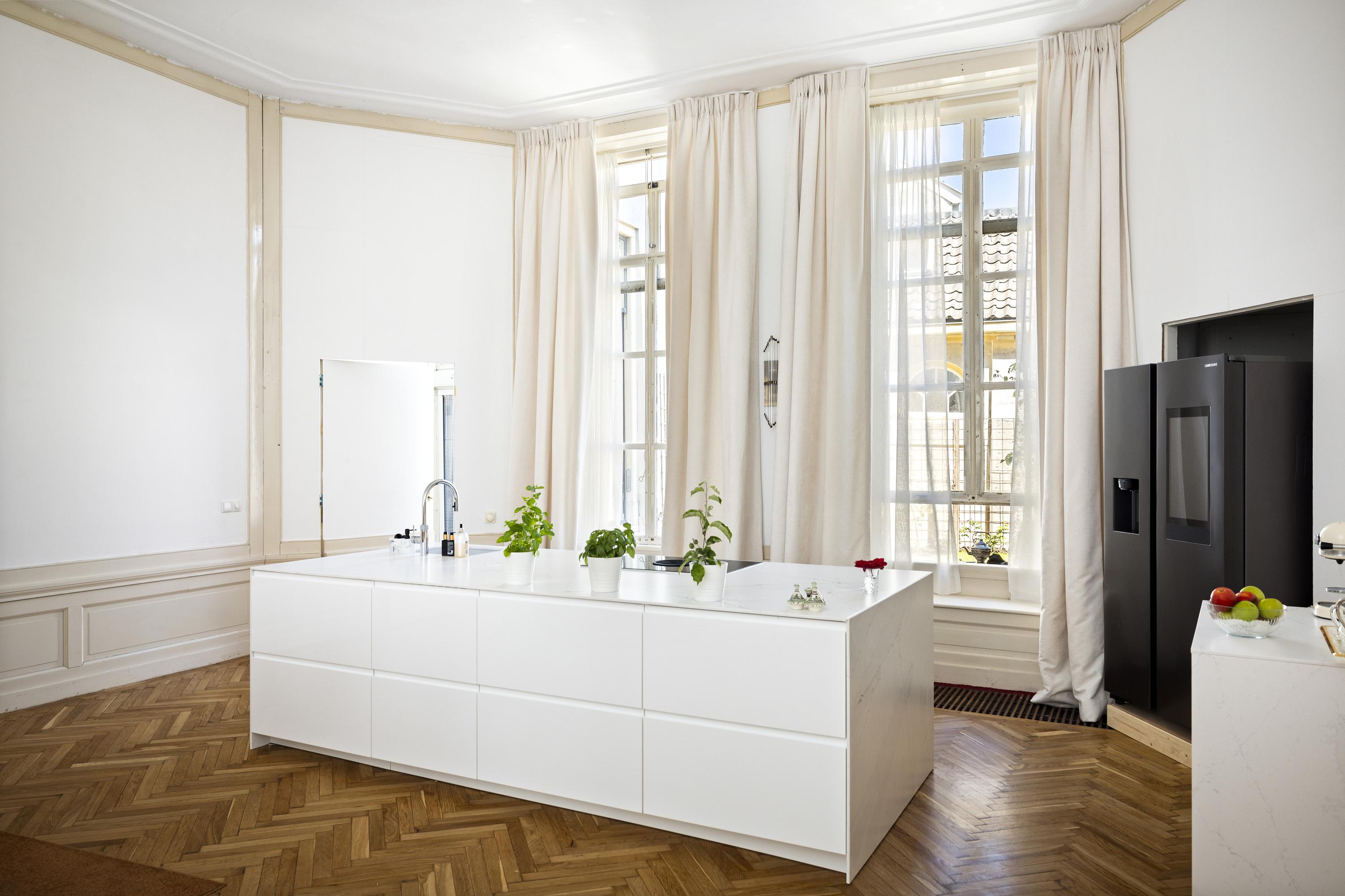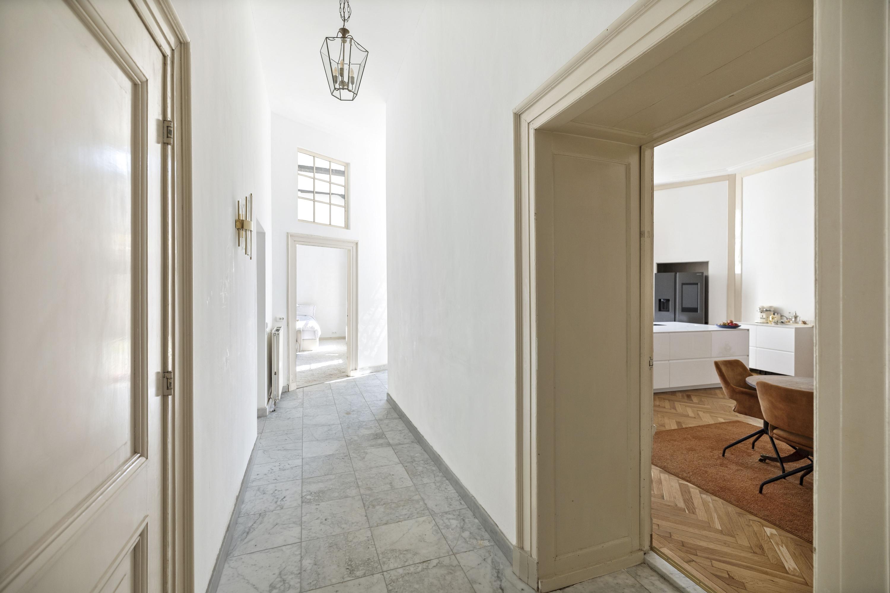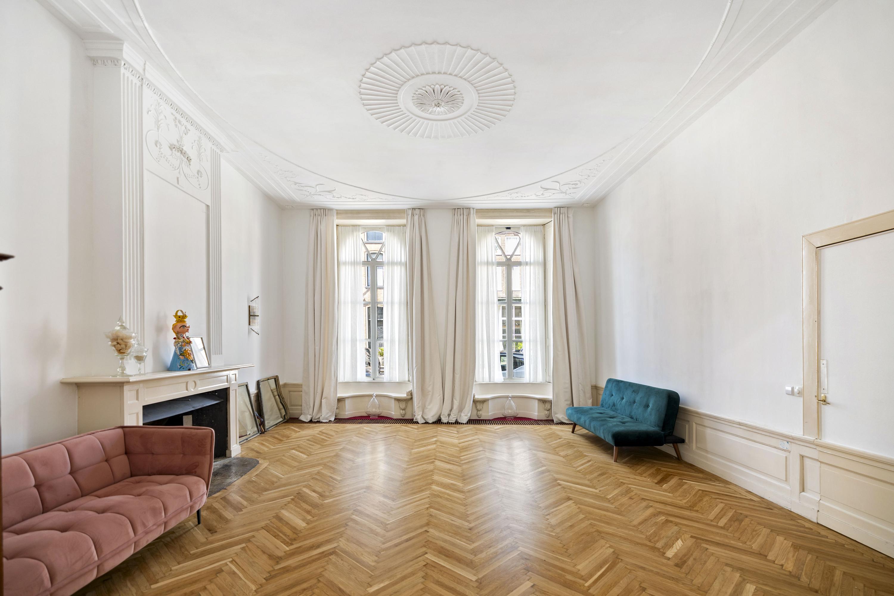 После традиционного двойного входа вас встречает вестибюль с мраморным полом, наполненный естественным светом. Почти 100 м² объединенной гостиной и кухни формируют основу первого этажа. Гостиная площадью 43 м² украшена оригинальными скамьями у окон и историческим каминным порталом, а елочный паркет из дуба создает изысканную и уютную атмосферу. Кухня оборудована белыми лаконичными шкафами, высокотехнологичной бытовой техникой, включая индукционную варочную панель с встроенной вытяжкой и большим холодильником с морозильником.