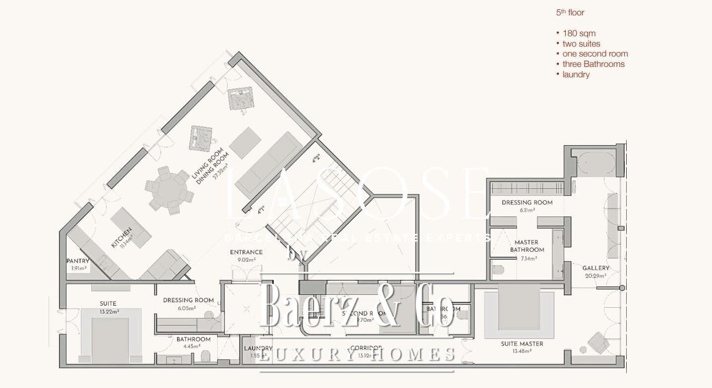 Flat Barcelona 在城市核心地带树立了当代生活的宁静典范,位于2021年全面翻新的楼宇五层,面积达184平方米。此臻品公寓配备三间卧室与三间浴室,甄选天然木质地板及高效能双层玻璃窗,确保居住的安静与舒适。中央空调与热泵暖气系统实现全年恒温的定制气候控制。